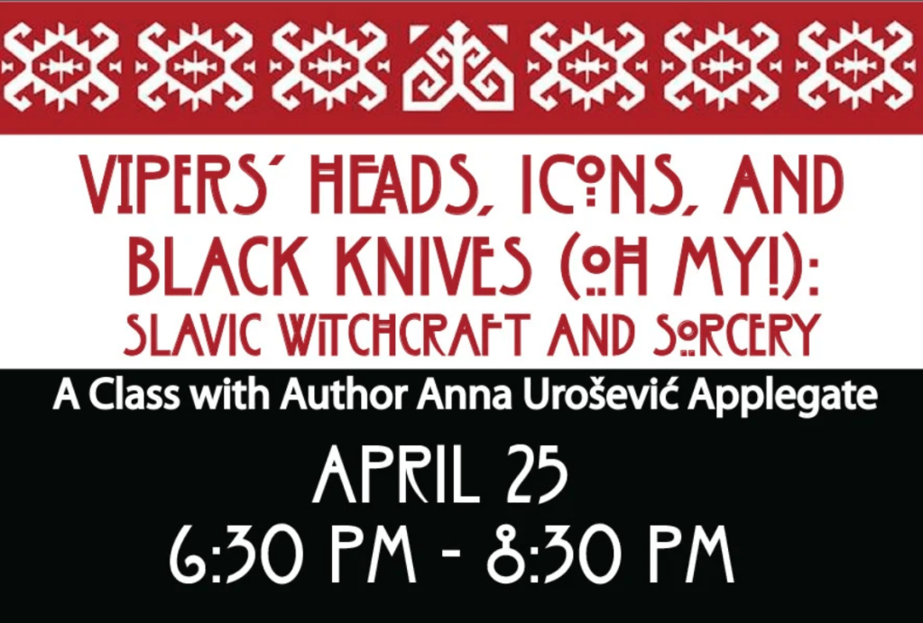 6:30 – 8:30 p.m. Learn about Witchcraft and Sorcery among the South Slavs of the Balkans from first-generation Serbian American vračara (witch) and author, Anna Urošević Applegate. $26 Tickets (book purchase of Slava! is separate).