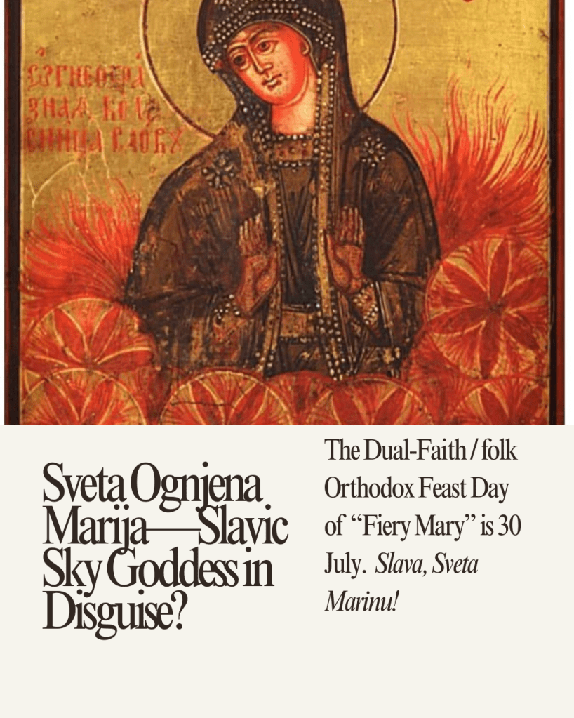 In Serbian Orthodox-informed Dual-Faith or Dvoverovanje, the period leading from the end of July to the beginning of August is a hazardous time. For rural folks in Serbia and elsewhere in Eastern Europe, it’s an intense time of arduous physical labor to process the harvest. It’s also a spiritually precarious time where the goal is to avoid the unwanted attentions of the pair of folk saints known as “Fiery Mary” (Ognjena Marija) and her “brother,” Sveti Ilija/Saint Elijah. Searing drought or a dangerous hailstorm sent by either of them can destroy the as-yet-unharvested crops.